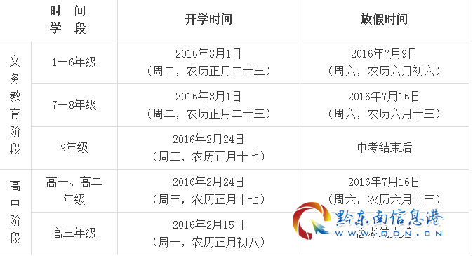 根據《義務教育課程設置實驗方案》、《普通高中課程方案(實驗)》、《省教育廳關于下達義務教育課程計劃(修訂)的通知》(黔教基發〔2009〕62號)、《省教育廳辦公室關于印發<貴州省普通高中課程改革實驗課程安排與管理指導意見(試行)>等普通高中課程改革實驗配套實施意見的通知》(黔教辦基〔2010〕137號)和《省教育廳關于堅決規范中小學辦學行為切實減輕學生過重課業負擔全面提高教育教學質量的意見》(黔教基發〔2011〕85號)等文件精神,結合我省中小學實際,現將我省中小學2015-2016學年度開學及放假時間印發給你們,請遵照執行。