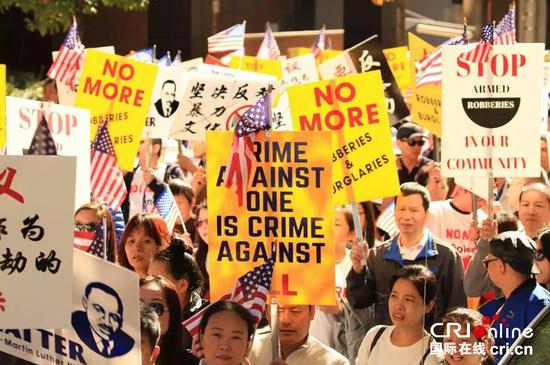 當(dāng)?shù)貢r間15日11點半,約兩千民眾聚集在費(fèi)城市政府大樓廣場,隨后游行隊伍從廣場游行兩英里至中國城,游行者們高舉橫幅標(biāo)語,上面寫著:“堅決反對暴力”,“抗議把華人作為暴力和搶劫的目標(biāo)”,“讓孩子遠(yuǎn)離暴力文化”。民眾高呼“不要搶劫”、“不要犯罪”、“要安全”、“反暴力”等口號。
