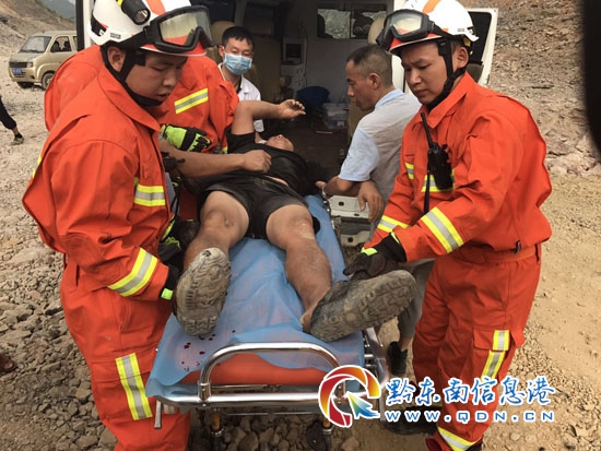 本網訊 7月31日8時,位于鎮遠縣五里牌工業大道在地圖中查看C標段,一名工人操作履帶式液壓鑿巖機不當,左腳不慎卡進履帶齒輪,情況緊急。消防官兵20分鐘的協同作戰,成功將被困工人救出。