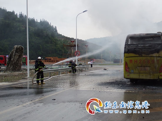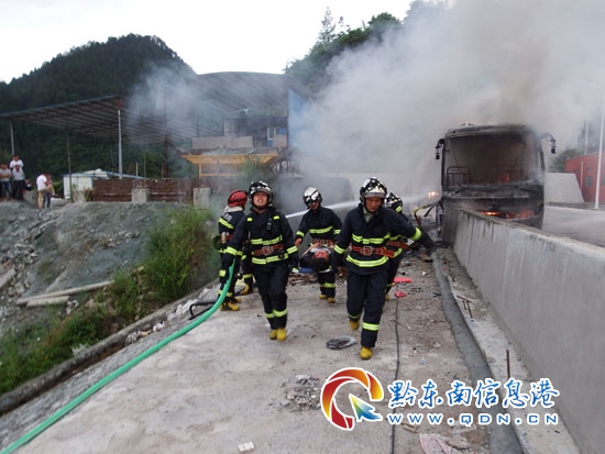 18時32分,消防官兵趕到現場,經過偵察了解得知,客車在隧道口打滑與前方行駛中的摩托車相撞,導致摩托車油箱泄露,與地面摩擦發生起火,整個車身已被熊熊大火包圍,客車是輛空車,摩托車上的兩人已被撞飛出數米遠,且意識陷入昏迷。了解現場情況后,消防官兵立即對現場實施警戒,疏散周圍群眾,并出兩支水槍對車身進行滅火,待火勢得到控制后,救援小組立即對受傷人員進行救援,利用擔架將兩名受傷人員送至救護車內。經過近10分鐘的撲救,大火被成功撲滅。為防止復燃現象發生,消防官兵繼續用水槍對整個車體進行冷卻,成功排出險情。