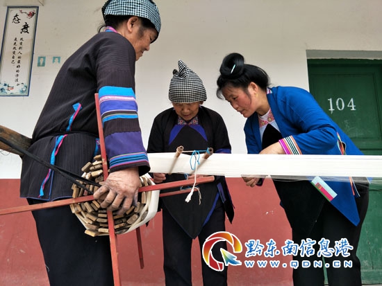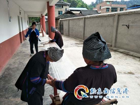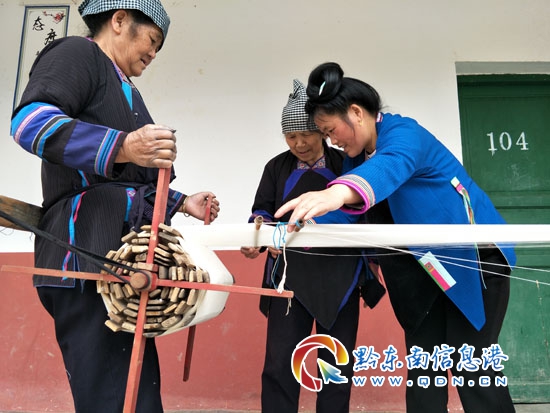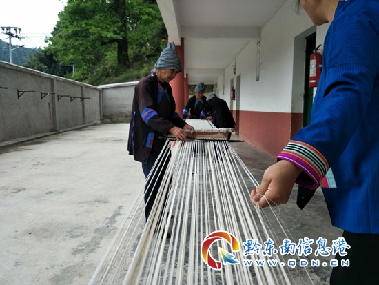 本網(wǎng)訊 5月23日,筆者在從江縣慶云鎮(zhèn)佰你村看到當?shù)囟弊鍕D女忙著經(jīng)線刷線,為織侗布做準備的手工技藝制作畫面。