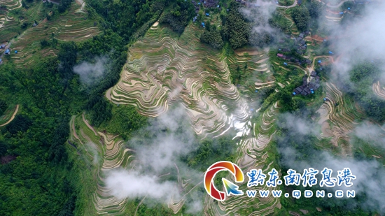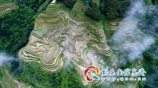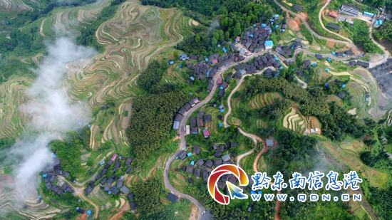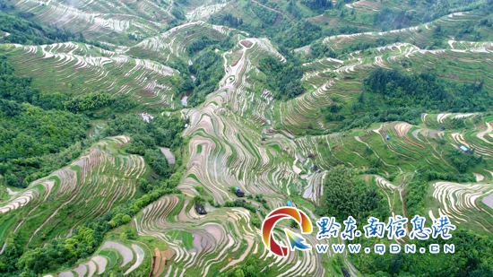 初夏時節,迎來一年一度的水稻栽插農忙季節,東朗梯田蓄水充盈、層疊如鏡、交錯縱橫,與苗寨獨具特色的吊腳木樓群交相輝映,美不勝收,更彰顯了苗族先民的智慧與膽魄。