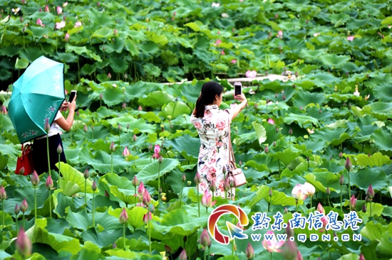 本網訊 眼下,從江縣洛香鎮四聯村今年種植的5000畝觀賞性的荷花已紛紛綻放,和美麗鄉村美景相得益彰,引來眾多游客觀賞和拍照留念。(潘開明)