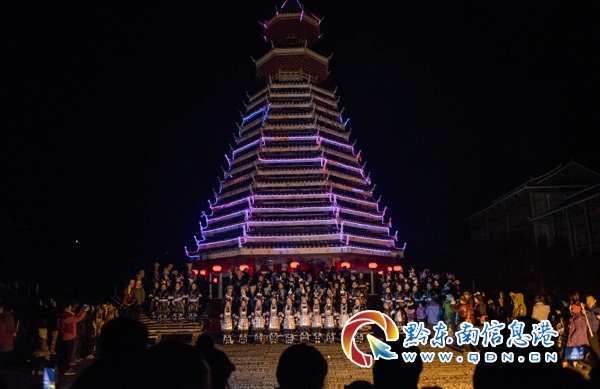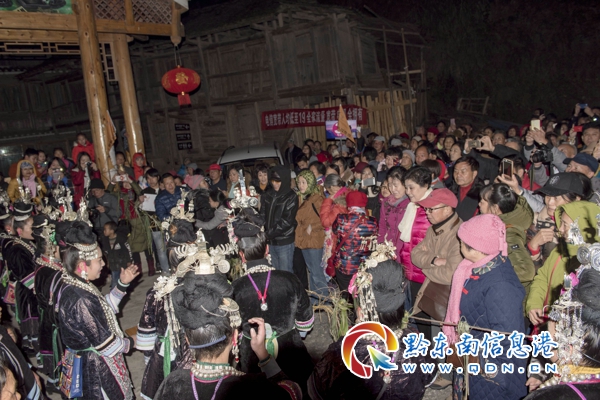 本網訊 12月30日晚,在“侗歌窩”——貴州省從江縣小黃村燈火通明,鑼鼓喧天,侗歌飛揚,好不熱鬧,當地侗族同胞身著民族盛裝歡天喜地迎來了“廣西千名游客走進神秘從江首發團”。