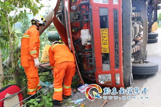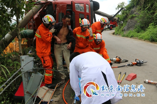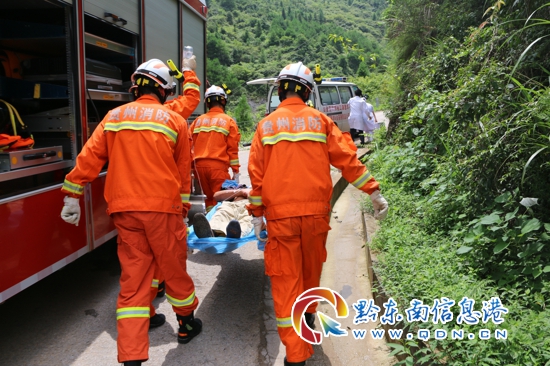 本網訊 8月17日11時03分,貴州丹寨縣消防大隊接到群眾報警,丹寨縣龍泉鎮高排村往汞礦方向路段發生一起交通事故,一人被困,情況緊急。接到報警后,丹寨縣消防大隊出動2車10名消防官兵前往處置。