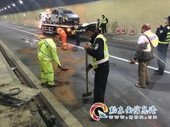近日,黔東南州公安局交警支隊高速一大隊二中隊民警接到報警電話稱,在余安高速凱里往丹寨方向的興仁隧道內,有一輛轎車仰翻在路上,嚴重影響后方車輛行車安全。