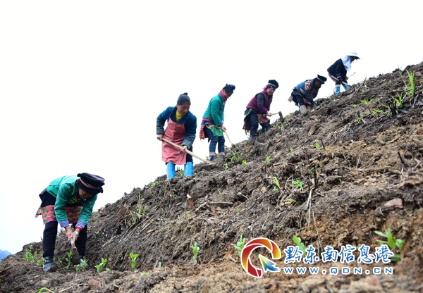 本網訊 連日來,貴州省黔東南苗族侗族自治州丹寨縣排調鎮送償村新建的400余畝茶葉基地,每天都有近100名苗族村民在搶種茶苗,茶葉種植成為了該村又一增收產業。