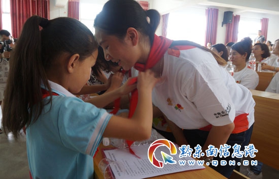 在儀式開始前,新州第三小學的學生們,為遠道而來的客人系上了紅領巾,表示了他們對于客人們的敬意與感謝。在校長致歡迎詞后,落成儀式正式開始。