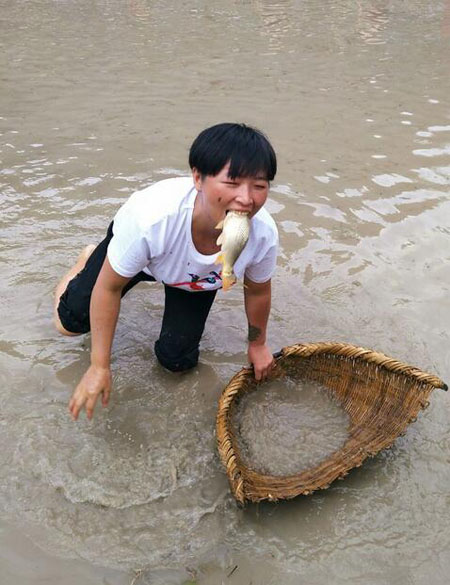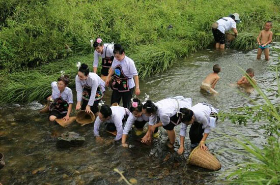 七夕這天,村里大姑娘小媳婦都要去捉魚。侗家人捉魚叫圍魚,那是一種非常有樂趣的圍獵活動(dòng):把撮箕呈弧形擺好,人兩邊打水,把驚慌失措的魚圍進(jìn)撮箕……
