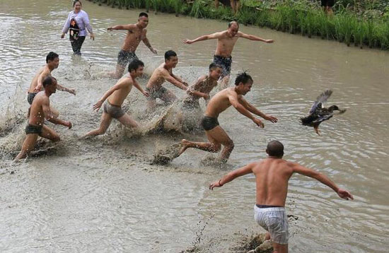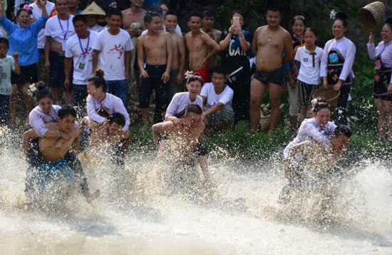 在水田里背媳婦比賽,也是謝寨七夕情人節(jié)的傳統(tǒng)娛樂項(xiàng)目,男人可以把自己心儀的女人背起就跑,誰跑得快,說明這男人身強(qiáng)體壯,會(huì)得到姑娘的歡心。
