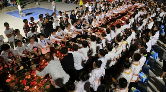 情人節(jié)里,有一樣活動(dòng)是必不可少的,那就是擺"夜筵"。"夜筵"本是侗家人結(jié)婚時(shí)在堂屋擺的筵席,男方親朋和女方送親的人互相恭賀,一起唱歌喝酒。
