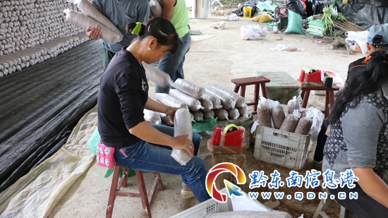 工人正在將菌木裝進袋子