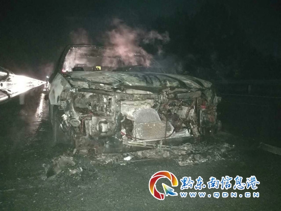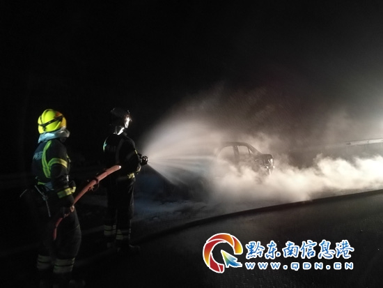 本網訊 2017年6月18日晚上22:40分許,黔東南州高速凱里大隊值班室接到群眾報警稱,在滬昆高速凱里西往凱里東方向,有一小車發生自燃,請出警。接警后,高速凱里大隊民警迅速趕往現場并通知消防隊。