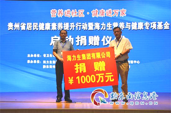 本網訊 (記者 葉敏)8月3日下午,“營養進社區·健康進萬家——貴州省居民健康素養提升行動”暨海力生“營養與健康專項基金”捐贈儀式在凱里市行政中心舉行。省衛生計生委黨組成員、省計生協專職副會長周承洲,黔東南州人民政府副州長、州計生協會長胡國珍出席儀式。