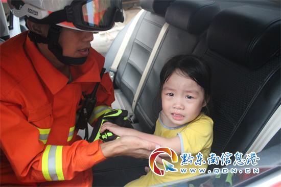 消防官兵到達現場后,發現一輛白色小轎車停在路中央,導致交通出現擁堵,車內一名大約4歲左右小女孩,淚眼婆娑,她的左手小臂部分皮膚已被“吸入”到車窗里。仔細觀察小孩手臂被卡的情況后發現,手臂是被向下吸入卡住的,由于卡槽與窗戶間隙太小,強行破拆極易對小孩造成二次傷害,為了減輕小孩的疼痛,消防官兵和小孩的家長在一旁安慰,分散其注意力。隨后,讓一名戰士在車外拉住車窗玻璃擴寬車窗縫隙,同時車內按住車窗升降開關,經過2分鐘的努力,成功地將小孩手臂從車窗內取出,所幸女孩無明顯傷勢。