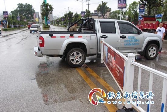 本網訊 6月14日中午,黎平公安交警大隊民警巡邏時至曙光大道體育館路段時,發現一輛皮卡車撞壞了道路中央護欄,橫跨在路中央,而車上無人,車門窗緊鎖。