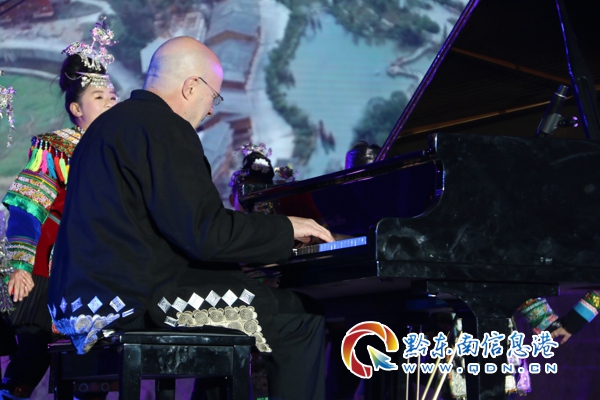 來自比利時的國際鋼琴大師尚馬龍所彈奏的一曲《讓世界聽見黎平》,配搭著舞臺上美麗翩躚的侗族歌者,點燃了全場氣氛。一曲奏畢,全場掌聲雷動,把晚會推向了高潮。