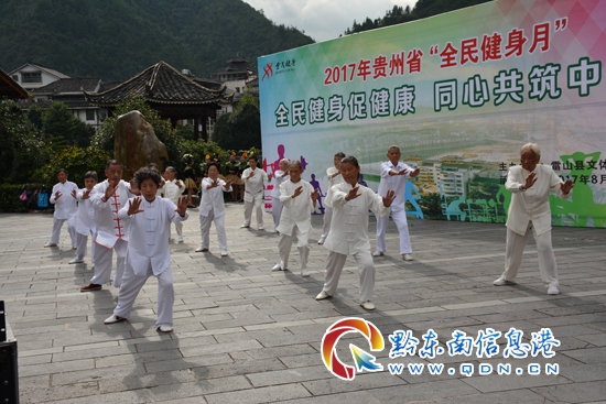 本網(wǎng)訊 8月8日是我國第九個(gè)“全民健身日”,當(dāng)日,由雷山縣文體廣電新聞出版局主辦以“全民健身促健康,同心共筑中國夢”為主題的2017年貴州省“全民健身月”活動(dòng)在縣城朩鼓廣場隆重舉行。當(dāng)天上午9時(shí)許,來自該縣映山紅隊(duì)、太極拳隊(duì)、貓貓河村隊(duì)、夕陽紅隊(duì)、柔力球隊(duì)、紅葉健身隊(duì)、苗嶺一枝花、杜鵑隊(duì)、小固魯村隊(duì)、紅陽健身隊(duì)、長豐村健身隊(duì)、陽茍村隊(duì)等12支代表隊(duì)、500余名健身愛好者身著亮麗秀美的民族服裝閃亮登場,展演了豐富多彩健身活動(dòng),吸引了上千各族群眾駐足觀看,展示了雷山全民健身活動(dòng)的成果,為迎接黨的十九大勝利召開營造歡樂祥和的氛圍。