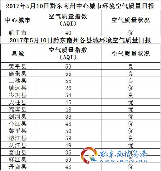 2017年5月11日黔東南州各縣(市)環境空氣質量日報
