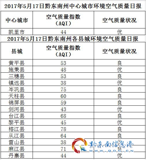 2017年5月18日黔東南州各縣(市)環境空氣質量日報