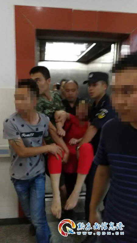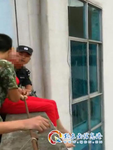7月19日下午6點左右,榕江警方接到群眾報警,在縣人民醫院住院部頂樓有一名身穿紅色衣服的女子欲跳樓輕生,請出警處置。榕江警方快速反應,迅速調集30名特戰隊員前往處置。