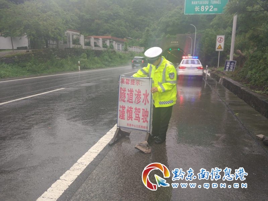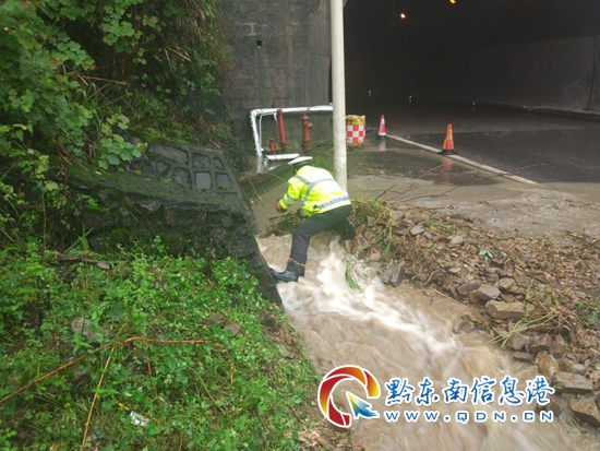 本網訊 近期黔東南州境內連續降雨導致山洪暴發,黔東南交警支隊高速三穗大隊及時調整勤務安排民警24小時巡邏保暢,2017年06月30日16時左右,高速三穗大隊劍河中隊民警在轄區開展汛期期間巡邏,當民警沿滬昆高速公路劍河往凱里方向巡邏,當巡邏至臺江縣境內南約溝隧道時發現隧道口有山洪流淌至高速公路,導致高速公路上積水嚴重,造成了很大的行車安全隱患。