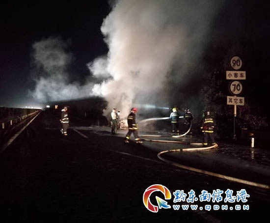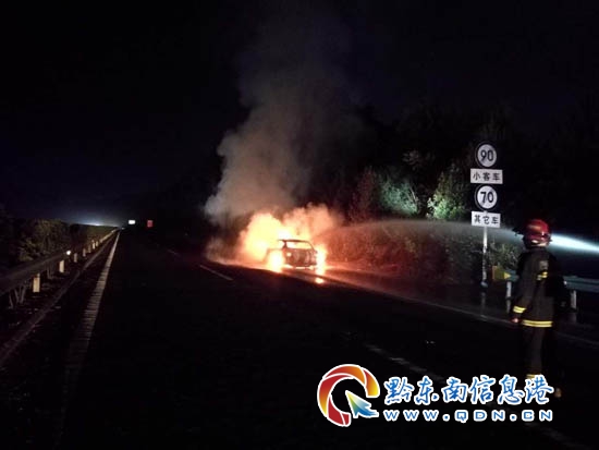 本網訊 8月6日晚上9時許,黔東南州高速凱里大隊值班室接群眾報警稱,在滬昆高速臺江往凱里方向,在牛巖山隧道附近,有一小車發生自燃,需要幫助。