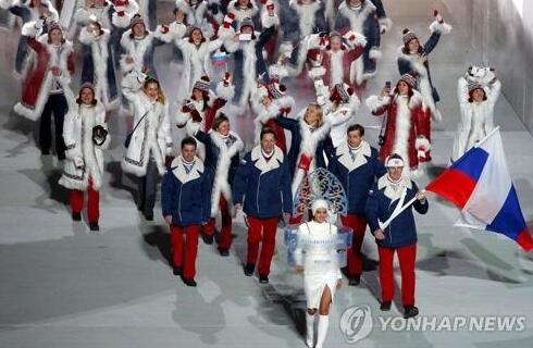 資料圖片:2014年2月,在俄羅斯索契冬奧開幕式上,俄羅斯代表團正在入場。(韓聯(lián)社)
