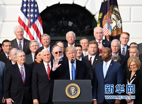 12月20日,在美國華盛頓白宮,美國總統特朗普(前)就國會通過稅改法案發表講話。美國國會參眾兩院20日通過了自1986年以來美國最大規模的稅改法案。該法案在送交總統特朗普簽署生效后,將于2018年1月開始實施。新華社記者殷博古攝