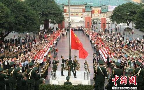 武警官兵升國旗,市民們行注目禮、高唱國歌。陳超 攝
