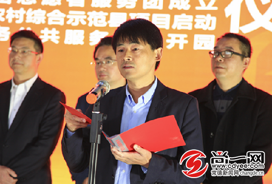 常德市人大常委會副主任、石門縣委書記譚本仲,石門縣委副書記、石門縣人民政府縣長郭碧勛為石門縣扶貧濟困志愿者服務團授旗、授牌。尚一網記者 裴維維 攝