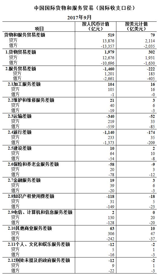 按美元計值,2017年9月,我國國際收支口徑的國際貨物和服務貿易收入2114億美元,支出2035億美元,順差79億美元。其中,貨物貿易收入1931億美元,支出1630億美元,順差302億美元;服務貿易收入183億美元,支出405億美元,逆差222億美元。
