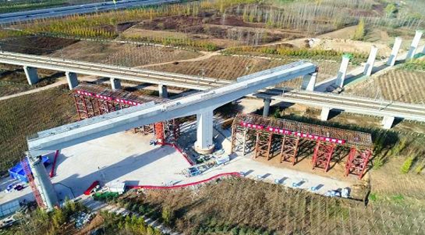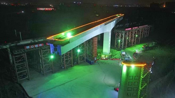 11月22日凌晨1時50分,由在漢央企中交二航局承建的鄭萬高鐵上行聯絡線萬噸T型剛構曲線橋,在大噸位千斤頂的牽引下,逆時針轉體50度,完美跨越正在運營的京廣高鐵,實現了國內首座萬噸級曲線T型高鐵橋成功轉體施工。