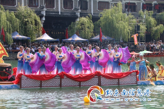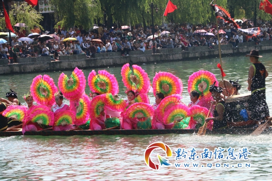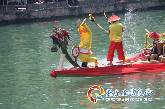 隨后,進行禮祭屈原活動,群龍游江、屈原問天、仙女撒花等民間民俗風情文化。除了參賽隊伍亮相外,不同顏色的彩龍、戲劇、人物、造型船、故事船等一并在氵舞陽河上有序進行展示,梁紅玉擊鼓抗金等故事船,龍頭水花四射,鑼鼓喧天,甚是熱鬧。游江結束,各龍舟隊返回比賽點,進行龍舟競賽。傳統龍舟賽比賽過程中分四個小組,小組賽船船見面隊隊pk,四個賽事組中每組產生前兩名,最后八支龍舟隊進行決賽。