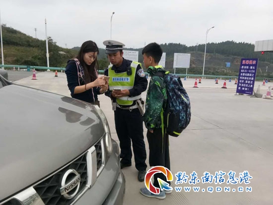本網訊 10月5日,國慶小長假第五天,黔東南高速三大隊民警在鎮遠西開展兩節安保專項行動時,發現一12歲少年在收費站入口處攔車,原來少年是一名騎行俠,出行的單車爆胎已經寄回,現在攔車無果,交警救援,助其平安返家。