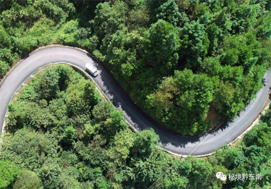 王曉雨駕駛小貨車(左上角白色汽車)從排調鎮蜿蜒的盤山公路經過(無人機拍攝)