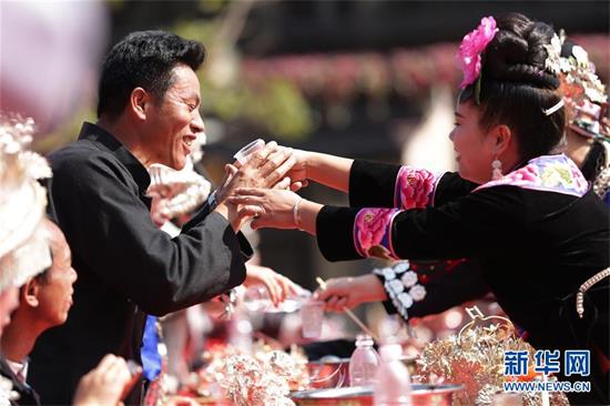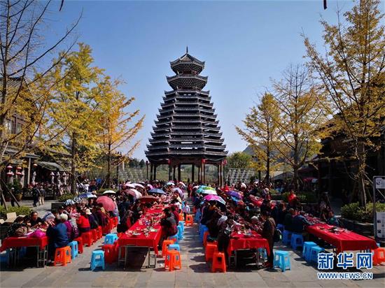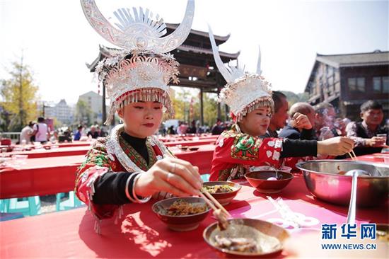 10月27日,在貴州省黔東南苗族侗族自治州丹寨縣萬達(dá)小鎮(zhèn),村民在長桌宴上敬酒。10月27日,貴州省黔東南苗族侗族自治州丹寨縣萬達(dá)小鎮(zhèn)舉辦主題為“萬人長桌宴 歡樂享金秋”的苗族長桌宴體驗活動,人們在歡聲笑語中樂享金秋。