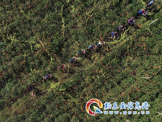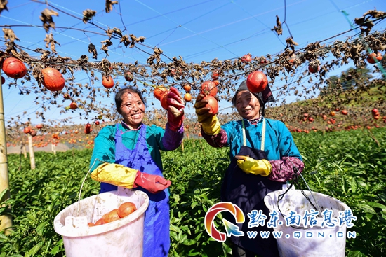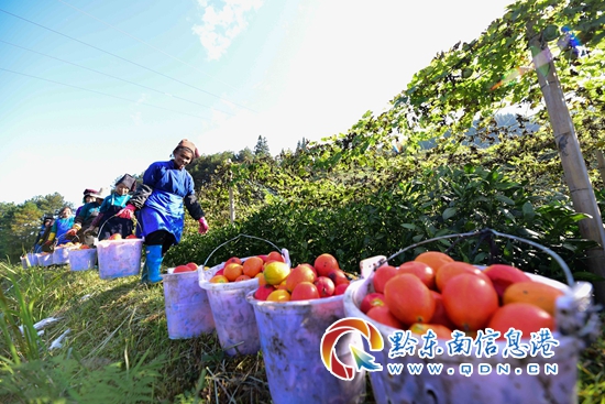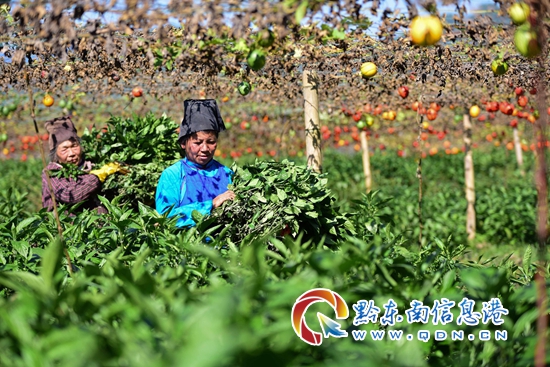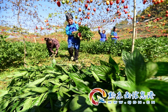 本網訊 立冬臨近,貴州省黔東南苗族侗族自治州丹寨縣排調鎮也要村揚起苗寨村民搶抓晴好天氣,在套種產業基地里采摘吊瓜、收割藍靛,田間地頭一派喜獲雙豐收的繁忙景象。