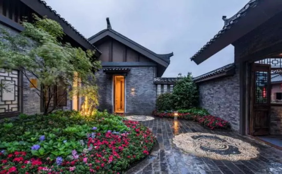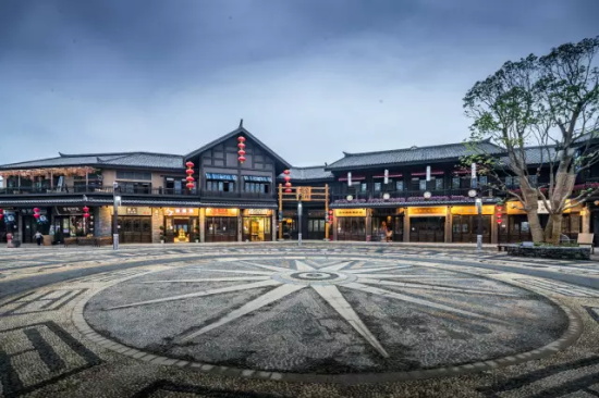 尤公廣場呈圓形設計,面積2000平米。它最大的設計亮點除了3層的吊腳牌樓,就是廣場的地面鋪裝,鋪裝紋樣采用了苗族特色的銅鼓紋樣,圖案深色的地方采用了當地古老的青磚,并搭配深淺不同的鵝卵石。