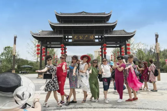 游客在牌樓前合影