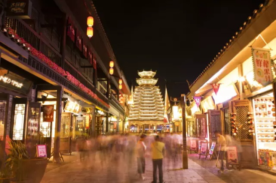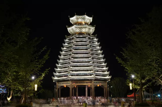 鼓樓廣場上的標志性建筑——鼓樓,可是有來頭的,它巍然挺立,有13層高,是侗族獨特風格的建筑,它是按照當地特色建筑找當地工匠原封不動還原出來的。它氣概雄偉,飛閣垂檐層層而上如同寶塔,瓦檐上或彩繪或雕刻著山水、龍鳳等圖案,云騰霧繞,五彩繽紛。