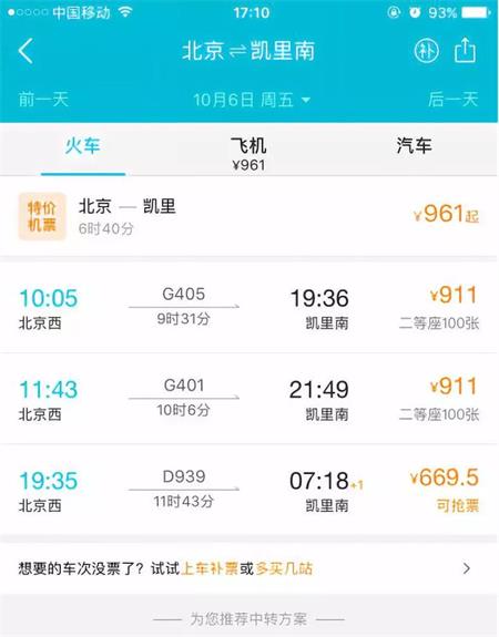 以北京為例,北京至凱里南站高鐵,全天共3趟。