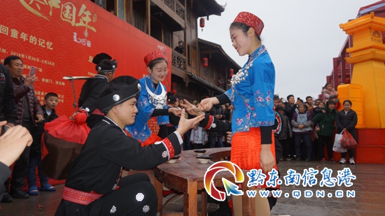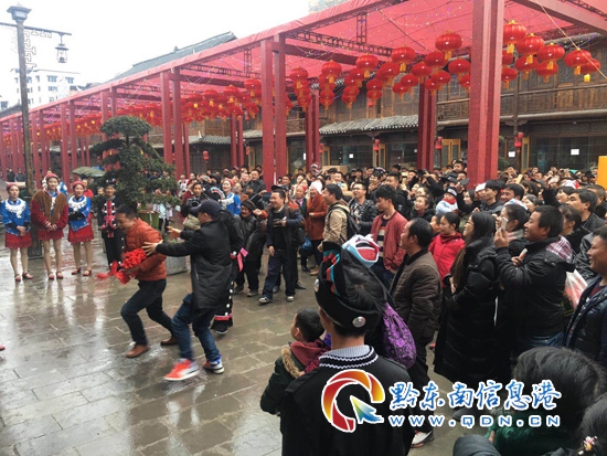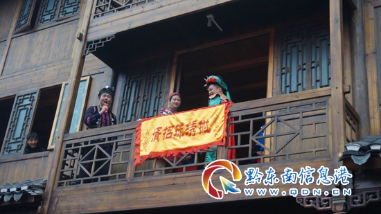 下午16時,舊州清云門前苗族姑娘和小伙們的苗族游方歌舞吸引著四方游客紛紛舉起手機拍照攝像。觀眾正看得起勁時,一鳴鑼出現在閣樓上的苗族中年男子吸引了大家的關注。鳴罷,男子帶出一貌美如花的苗族妙齡女子,幾句開場調侃后便讓女子將一繡球拋下。原來,這是舊州古城文藝演出中的“黃員外嫁女”環節,樓下的游客紛紛上前瘋搶。期間,手腳麻利的男子,一步上前抓到繡球。該游客就成了“黃員外”的女婿。在眾游人的歡呼下,男子被請上閣樓,拜堂成親、送入洞房,樓下游客還收到了“黃員外”家人送去的一杯杯美酒。