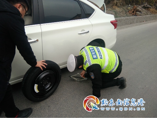正在彭先生束手無策之際,經(jīng)過此地的劍河縣公安局交警大隊教導(dǎo)員吳斌和兩名輔警見狀后,立即停車上前詢問。彭先生便將情況向民警進行了說明,并向執(zhí)勤民警求援。在得知情況后,吳教導(dǎo)員一邊安撫彭先生不要著急,一邊組織人員在車后50米擺放了警示標(biāo)志做好安全措施,并取出警車上的工具幫助彭先生架車、拆卸、換胎……見民警不顧路面上的泥灰俯身在地面上幫助自己拆卸受損的車胎,彭先生向民警連聲道謝。