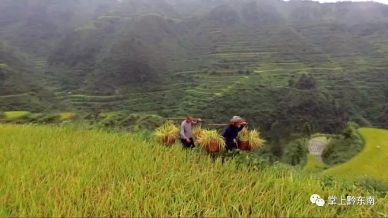 由于海拔高低不同,同一梯田里相同品種的水稻成熟的時間也不同。每年村民們都相互幫忙,晚的幫早的,早的又幫晚的。龍昌吉老人的稻田海拔偏低一點,收割早,今天他又迎來幾個村民。大家你割稻我打谷,很快一挑挑金黃的稻谷就滿載而歸。