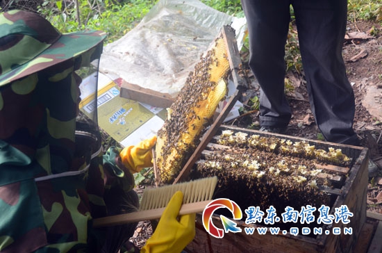 本網(wǎng)訊 春回大地,百花齊放。2018年4月17日,錦屏縣鐘靈鄉(xiāng)高寨村村民歐友成正在采收自家的蜂蜜。