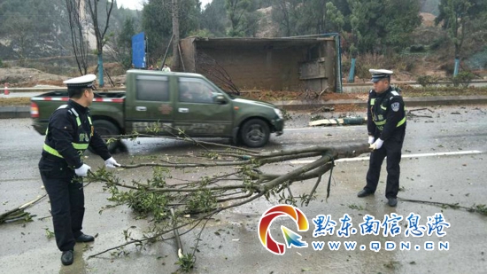 在等待救援車到來的時(shí)間里,巡邏交警對路面上散落的樹干和泥沙進(jìn)行清理,指揮過往車輛安全通過。