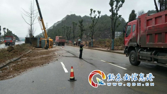 本網(wǎng)訊 1月3日11時(shí)30分左右,凱里市公安局交警大隊(duì)開懷片區(qū)中隊(duì)巡邏交警在日常巡邏時(shí)發(fā)現(xiàn),在二龍至臺盤城市干道(金硐絲路段)有一輛大貨車發(fā)生側(cè)翻在路中間,事故導(dǎo)致隔離帶中的幾棵綠化樹被撞斷,道路雙向散落著被撞斷的樹干和泥沙,再加上路面濕滑,存在極大的安全隱患。