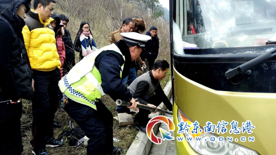 見(jiàn)此情況,顧明杰副大隊(duì)長(zhǎng)迅速將警車停靠在大客車后方,并組織同車輔警林尚廷,在警車后方150米左右擺放好安全錐筒,以便提醒后方來(lái)車安全避讓。隨后組織車上乘客下車,到安全地帶等候。通過(guò)詢問(wèn)得知,大客車是從黎平縣尚重鎮(zhèn)駛來(lái),準(zhǔn)備去凱里,行經(jīng)該路段時(shí),突然右前輪爆胎無(wú)法繼續(xù)前行,駕駛員就借助慣性將車停靠在應(yīng)急車道上,準(zhǔn)備跟換輪胎。