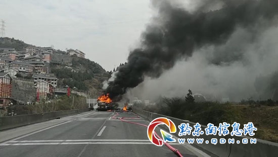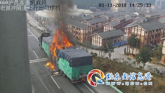 本網訊 昨天(1月11日)一條關于“凱里一貨車高速公路上自燃,現場濃煙滾滾,陣勢駭人”的新聞傳遍凱里人的微信朋友圈。視頻中能看到一輛大貨車停在凱里民族風情園附近的高速公路橋上冒著滾滾濃煙,燃著熊熊火焰,期間還伴隨著一聲類似爆炸聲的巨響。
